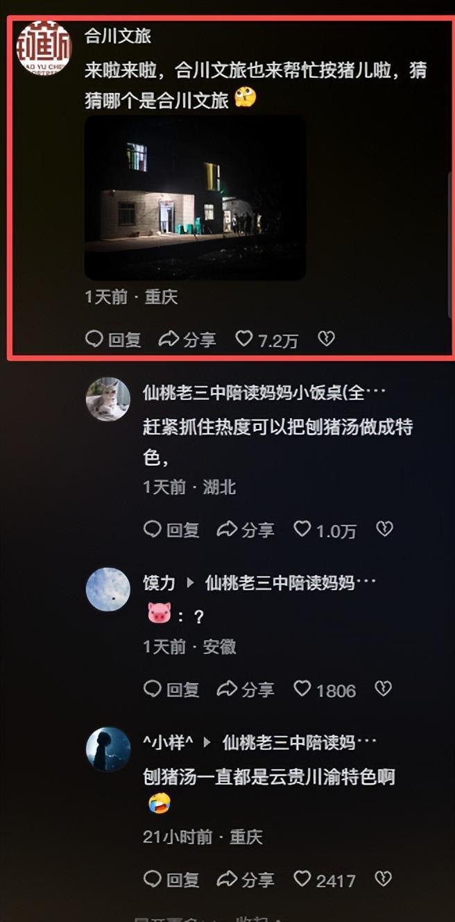 网友创作的二创视频、表情包、段子满天飞,有人甚至编了顺口溜:“2026第一火,合川呆呆杀年猪;城里人都往村里跑,就为一口刨猪汤。”