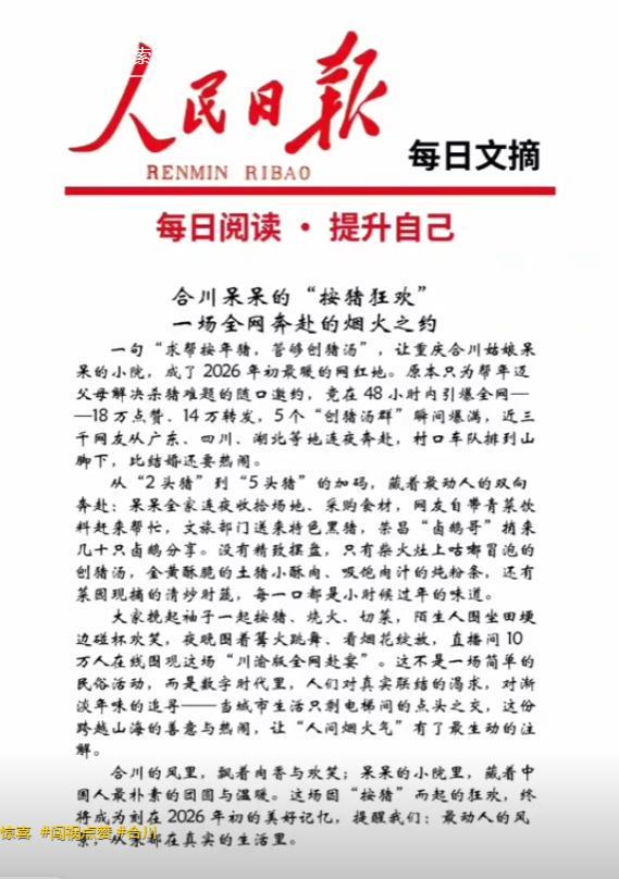 这“破天的富贵”,终于吹向了合川......自从2026年开始,不管是娱乐圈还是网红圈,亦或是社会新闻,各种事件都蜂拥而至,一桩接着一桩,剧情的发展又让人始料不及。但最让人意想不到的是,一个23岁重庆姑娘随手发的杀猪求助视频,居然能把整个合川区推上全国热搜。更夸张的是,这事火到了央视镜头前,人民日报都两次点名报道,但随之而来的还有恶心的一幕,就连网名呆呆都难...